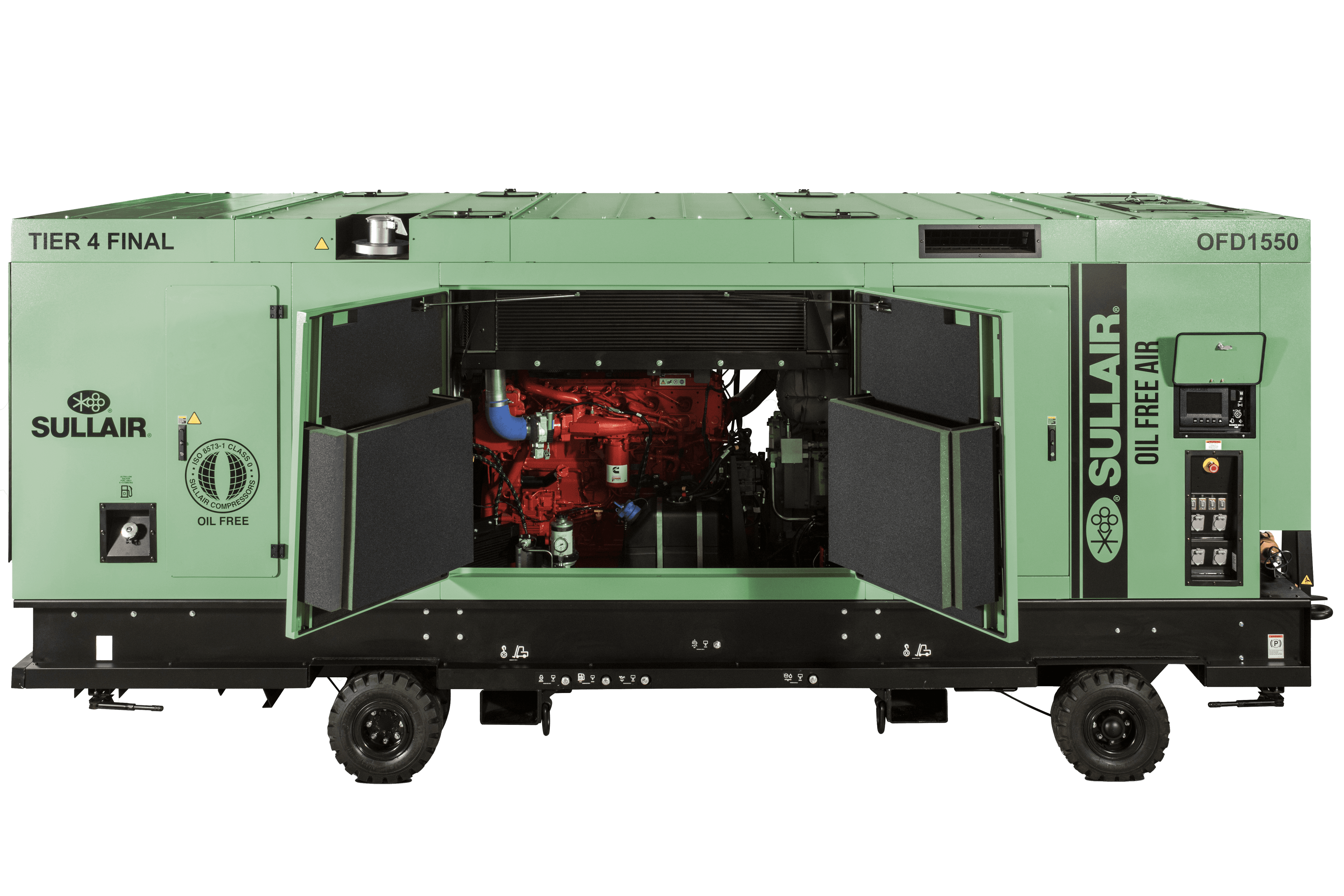 Tier 4 Final Emissions Compliant—Provides Class 0 Oil Free Air in a package designed for both short-term and longer-term usage. Featuring the legendary Sullair Dry Screw Two-Stage Air End driven by a powerful Cummins QSX15 diesel engine, the OFD1550 provides versatile operation — even in environmentally sensitive applications.